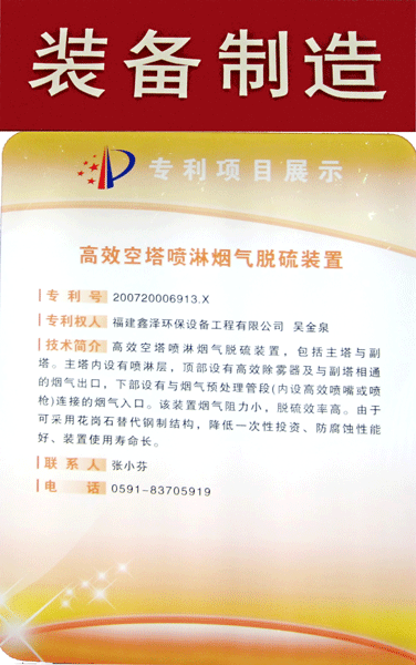 我公司专利“高效空塔喷淋烟气脱硫装置”展板与模型在福建省知识产权局优秀专利项目展区展示。 经过多年发展,该交易会已成为福建省大力推进科技创新、国际交流的平台和两岸合作的平台,成为海内外项目、技术、资本、人才等创新要素的一大集聚,为福建省经济结构调整和经济发展方式的转变提供了强有力的技术支撑,成为海西加速发展的强力推进器。
