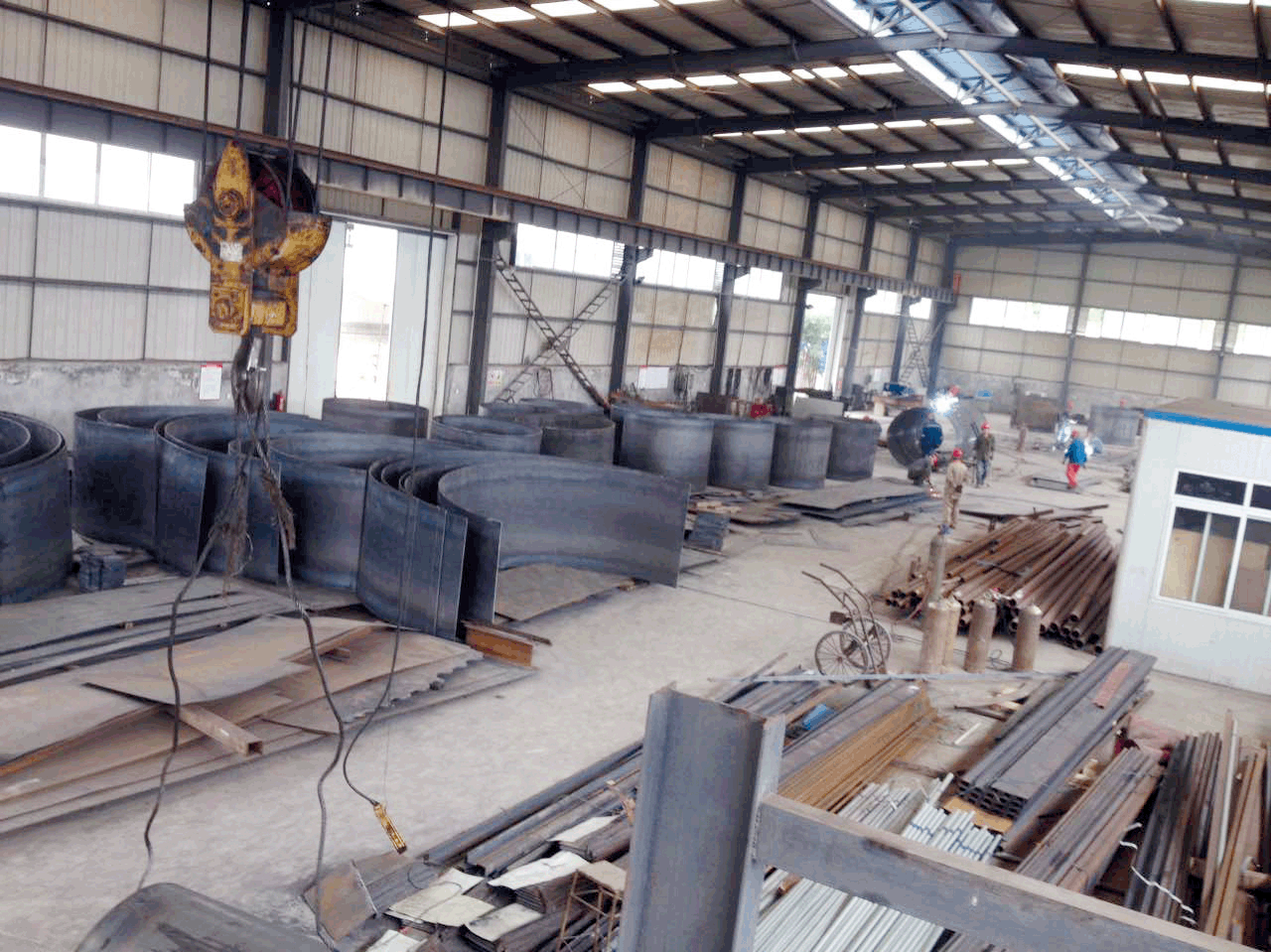 本工程主体为烟塔合一,总高约60米,项目工期紧,我公司在合同签订后立即展开设计,成立工程项目部,组织施工班组于11月15日进场,开展各项施工作业。项目部根据进度计划精心组织,合理安排,各施工专业紧密配合,经过数十日的努力,目前已完成直排烟囱段的预制拼接,塔体段的卷板预制。